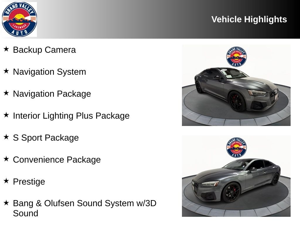 Backup Camera, Adaptive Cruise Control w/Traffic Jam Assist, Animation for Headlights & Taillights, Audi Active Lane Assist, Audi Advanced Key, Audi Laser Light & Headlight Washers, Audi Side Assist w/Pre Sense Rear, Audi Virtual Cockpit Plus, Bang & Olufsen Sound System w/3D Sound, Convenience Package, Driver Seat Memory, Hands-On Detection Steering Wheel, Head-Up Display, Heated Steering Wheel, Interior Lighting Plus Package, MMI Navigation Plus, Navigation Package, Navigation System, Park Assist, Parking System Plus (Front/Rear Acoustic Sensors), Power moonroof, Prestige, S Sport Package, SiriusXM All Access Service, Sport Adaptive Damping Suspension, Sport Rear Differential, Top View Camera System, Traffic Sign Recognition. CARFAX One-Owner. Clean CARFAX. Priced below KBB Fair Purchase Price! 21/30 City/Highway MPG