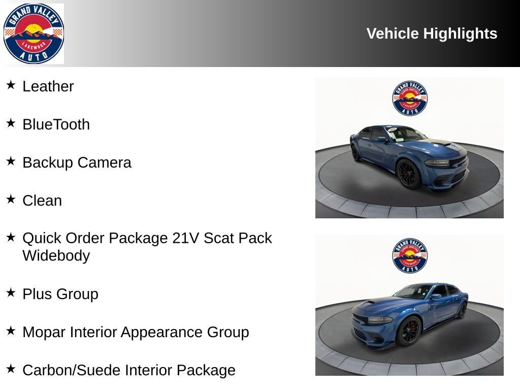 Leather, BlueTooth, Backup Camera, Clean, 19 harman/kardon GreenEdge Speakers, Adaptive Damping Suspension, All Speed Traction Control, Apple CarPlay/Android Auto, Auto Adjust In Reverse Exterior Mirrors, Auto-Dimming Exterior Driver Mirror, Black-Edged Premium Floormats, Blind Spot & Cross Path Detection, Blind Spot Memory/Power/Heat Mirror, Body Color Fender Flares, Brembo 6-Pot Fixed Front Caliper Brakes, Carbon/Suede Interior Package, Driver & Passenger Lower LED Lamps, Exterior Mirrors Courtesy Lamps, Flat-Bottom Steering Wheel, Front Overhead LED Lighting, harman/kardon Audio Group, harman/kardon GreenEdge Amp, Heated 2nd Row Seats, Heated front seats, Heated steering wheel, Illuminated Rear Cupholders, Leather Shift Knob, Mopar Bright Door Sills, Mopar Interior Appearance Group, MOPAR Premium Floor Mats w/Logo, ParkView Rear Back-Up Camera, Performance Shift Indicator, Plus Group, Power Driver/Passenger 4-Way Lumbar Adjust, Power Front Driver/Passenger Seats, Power Tilt/Telescope Steering Column, Premium-Stitched Dash Panel, Quick Order Package 21V Scat Pack Widebody, Radio: Uconnect 4C w/8.4" Display, Radio/Driver Seat/Mirrors Memory, Real Carbon Fiber Interior Accents, Rear Seat Armrest w/Storage Cupholder, Scat Pack Logo Nappa/Alcantara Seat, Steering wheel mounted audio controls, Suede Headliner, Surround Sound, Trunk Mat w/Logo, Ventilated Front Seats, Wheels: 20" x 11" Devil's Rim Aluminum, Widebody Competition Suspension, Widebody Package.