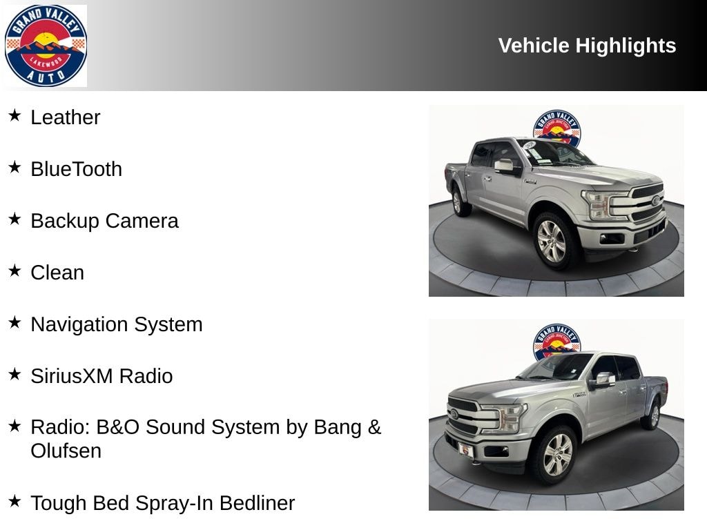 Leather, BlueTooth, Backup Camera, Clean, 20" Polished Aluminum Wheels, Class IV Trailer Hitch Receiver, Exterior Parking Camera Rear, Fully automatic headlights, Heated door mirrors, Heated front seats, Heated rear seats, Heated steering wheel, Navigation System, Radio: B&O Sound System by Bang & Olufsen, Rear Parking Sensors, SiriusXM Radio, SYNC 3, Tough Bed Spray-In Bedliner, Ventilated front seats, Voice-Activated Touchscreen Navigation.