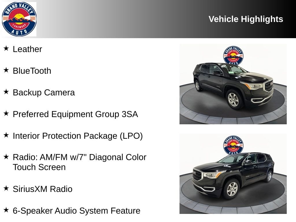 Leather, BlueTooth, Backup Camera, 17" x 7.5" Aluminum Wheels, 1st & 2nd Row All Weather Floor Mats (LPO), 3rd Row All Weather Floor Mats (LPO), 6-Speaker Audio System Feature, All Weather Cargo Mat (LPO), Apple CarPlay/Android Auto, Emergency communication system: OnStar and GMC connected services capable, Exterior Parking Camera Rear, Fully automatic headlights, Heated door mirrors, Interior Protection Package (LPO), Preferred Equipment Group 3SA, Radio: AM/FM w/7" Diagonal Color Touch Screen, SiriusXM Radio, Steering wheel mounted audio controls. CARFAX One-Owner. 21/26 City/Highway MPG