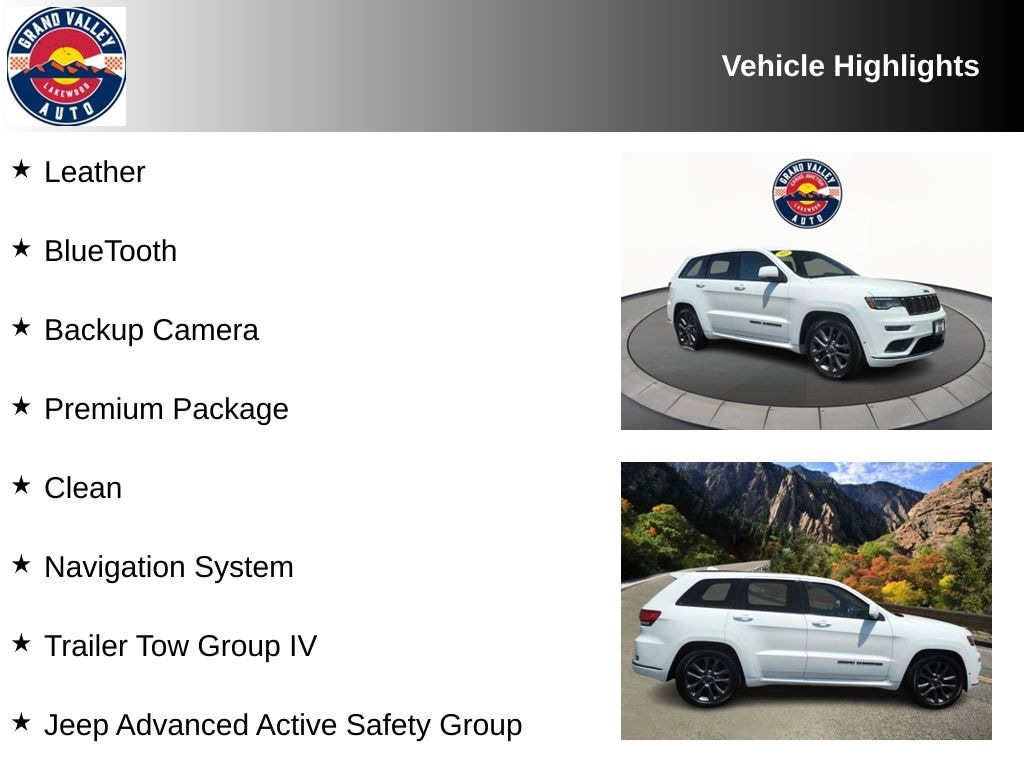 Leather, BlueTooth, Backup Camera, Premium Package, Clean, 10 Speakers, 7 & 4 Pin Wiring Harness, 8.4" Touchscreen Display, Adaptive Cruise Control w/Stop, Advanced Brake Assist, Apple CarPlay/Android Auto, Class IV Receiver Hitch, Dual Bright Exhaust Tips, Dual Dark Chrome Exhaust Tip, Emergency communication system: SiriusXM Guardian, Full Speed FWD Collision Warn Plus, Heated door mirrors, Heated front seats, Heated rear seats, Heated steering wheel, High intensity discharge headlights: Bi-Xenon, Jeep Advanced Active Safety Group, Lane Departure Warning Plus, Leather Shift Knob, Leather steering wheel, Leather Wrapped Steering Wheel, Nappa Leather Trimmed Bucket Seats, Navigation System, Parallel & Perp Park Assist w/Stop, ParkView Rear Back-Up Camera, Power Liftgate, Power moonroof: Dual-Pane Panoramic, Premium LED Fog Lamps, Radio: Uconnect 4C Nav w/8.4" Display, Rain Sensitive Windshield Wipers, Roof rack: rails only, Steering wheel mounted audio controls, Trailer Tow Group IV, Ventilated front seats, Wheels: 20" x 8.0" Polished/Tech Gray Aluminum.