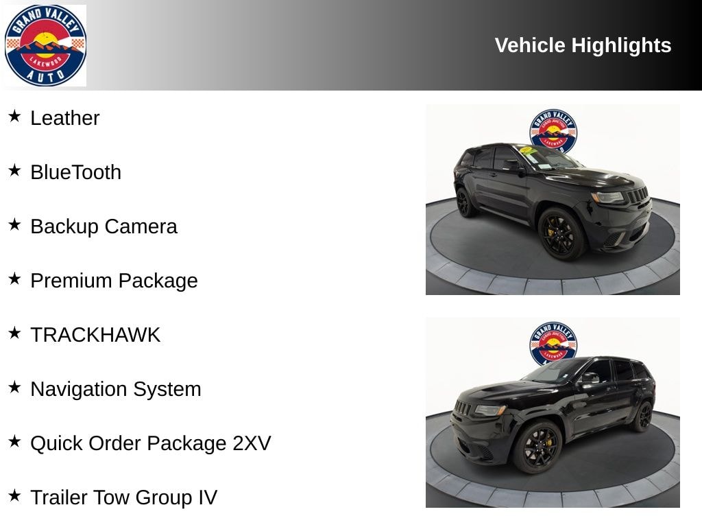 Recent Arrival! Leather, BlueTooth, Backup Camera, Premium Package, TRACKHAWK, 19 Speakers High Performance Audio, 7 & 4 Pin Wiring Harness, 8.4" Touchscreen Display, 825 Watt Amplifier, Anti-whiplash front head restraints, Class IV Receiver Hitch, Competition Suspension, Heated front seats, Heated steering wheel, Heavy-Duty Engine Cooling, High intensity discharge headlights: Bi-Xenon, High Performance Audio, Laguna Leather Care Instruction Tag, Laguna Leather Performance Seats, Laguna Leather Reserve Door Trim, Leather Wrapped Lower Panels, Navigation System, Quick Order Package 2XV, Signature Leather Wrapped Interior Package, Steering wheel mounted audio controls, Trailer Tow Group IV, Wheels: 20" x 10.0" Black Satin Aluminum.