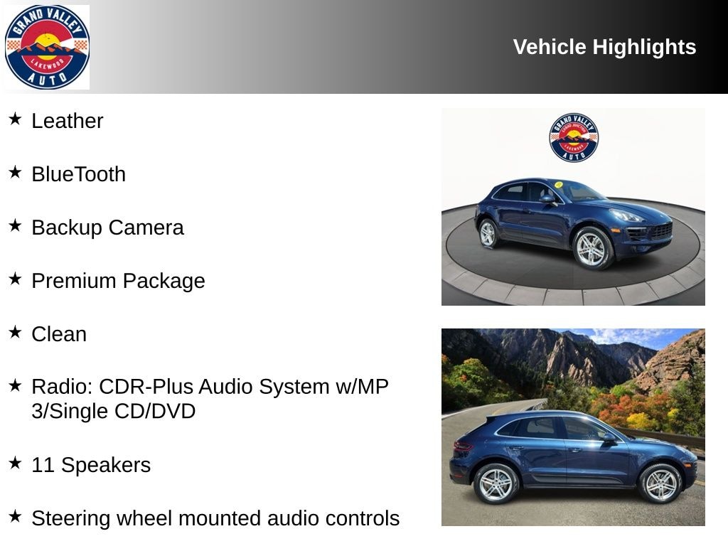 Leather, BlueTooth, Backup Camera, Premium Package, Clean, 11 Speakers, Alcantara/Leather Seat Trim, Heated door mirrors, High intensity discharge headlights: Bi-Xenon, Leather Shift Knob, Power Liftgate, Radio: CDR-Plus Audio System w/MP3/Single CD/DVD, Rain sensing wipers, Sport steering wheel, Steering wheel mounted audio controls, Wheels: 19" Macan Design. Priced below KBB Fair Purchase Price!