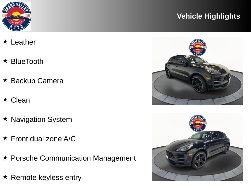 Leather, BlueTooth, Backup Camera, Clean, ABS brakes, Electronic Stability Control, Front dual zone A/C, Fully automatic headlights, Heated door mirrors, Illuminated entry, Leather Shift Knob, Low tire pressure warning, Navigation System, Panoramic Roof System, Partial Leather Seat Trim w/Alcantara, Porsche Communication Management, Power Liftgate, Rain sensing wipers, Remote keyless entry, Sport steering wheel, Steering wheel mounted audio controls, Traction control, Wheels: 18" Macan.