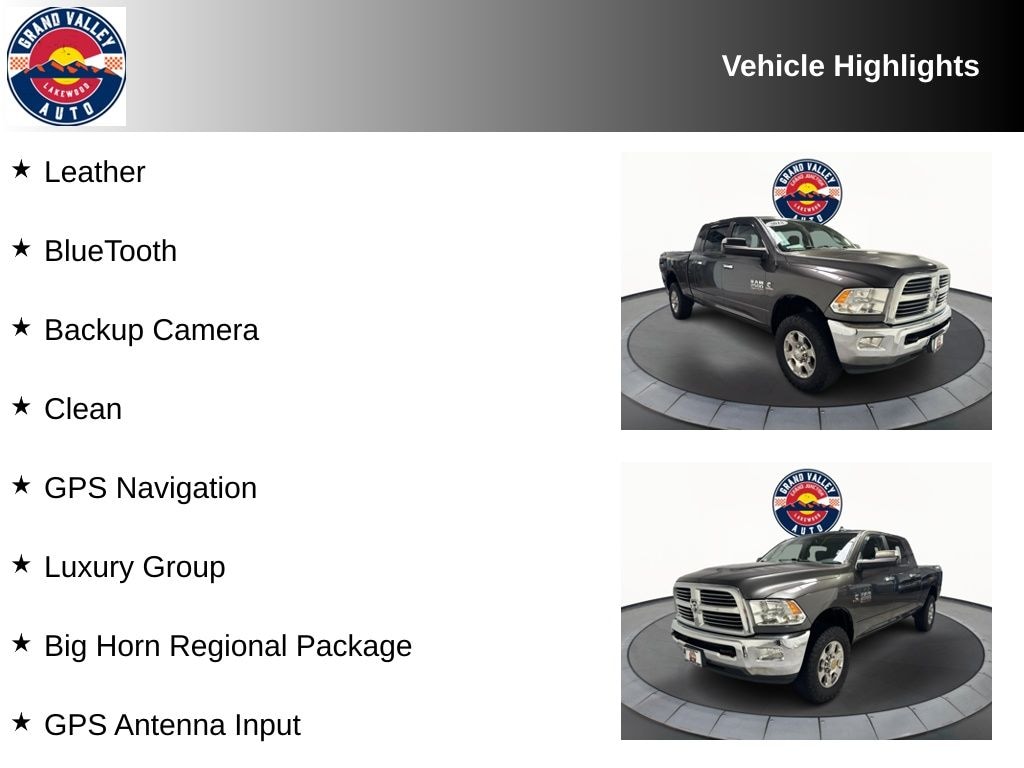 Leather, BlueTooth, Backup Camera, Clean, 1-Year SiriusXM Guardian Trial, 40/20/40 Split Bench Seat, 5-Year SiriusXM Traffic Service, 5-Year SiriusXM Travel Link Service, 8.4" Touchscreen Display, Air Conditioning ATC w/Dual Zone Control, Apple CarPlay, Auto-Dimming Exterior Mirrors, Auto-Dimming Rear-View Mirror, Big Horn Badge, Big Horn Regional Package, Electroluminescent Instrument Cluster, Exterior Mirrors Courtesy Lamps, Exterior Mirrors w/Supplemental Signals, For Details Visit DriveUconnect.com, Glove Box Lamp, Google Android Auto, GPS Antenna Input, GPS Navigation, HD Radio, Heated door mirrors, Integrated Center Stack Radio, Integrated Voice Command w/Bluetooth, Leather Wrapped Steering Wheel, Luxury Group, Media Hub (2 USB, AUX), Next Generation Engine Controller, Overhead Console w/Garage Door Opener, ParkSense Rear Park Assist System, ParkView Rear Back-Up Camera, Power Heated Fold-Away Mirrors (GUK), Power-Folding Mirrors, Radio: Uconnect 4C Nav w/8.4" Display, Rear Dome w/On/Off Switch Lamp, Remote Start System, SiriusXM Satellite Radio, SiriusXM Traffic Plus, SiriusXM Travel Link, Steering Wheel Mounted Audio Controls, Sun Visors w/Illuminated Vanity Mirrors, Universal Garage Door Opener, USB Host Flip.