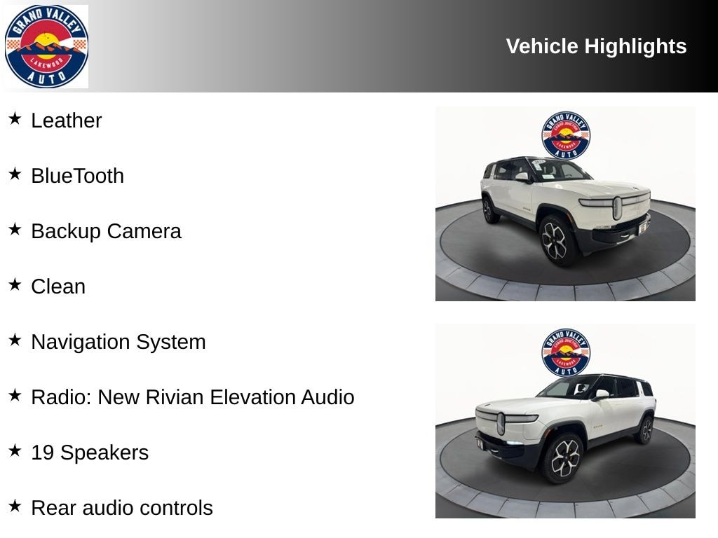 Leather, BlueTooth, Backup Camera, Clean, 19 Speakers, Active Cruise Control, Adaptive suspension, Auto High-beam Headlights, Auto tilt-away steering wheel, Auto-dimming door mirrors, Auto-leveling suspension, Brake assist, Electronic Stability Control, Exterior Parking Camera Rear, Front Bucket Seats, Front dual zone A/C, Heated & Ventilated Front Bucket Seats, Heated steering wheel, Navigation System, Perf Vegan Leather Seat Trim w/Patterned Stitching, Radio: New Rivian Elevation Audio, Rain sensing wipers, Rear audio controls, Rear dual zone A/C, Security system, Steering wheel mounted audio controls, Turn signal indicator mirrors, Wheels: 21" Road Machined Aluminum. Clean CARFAX. Odometer is 4170 miles below market average!