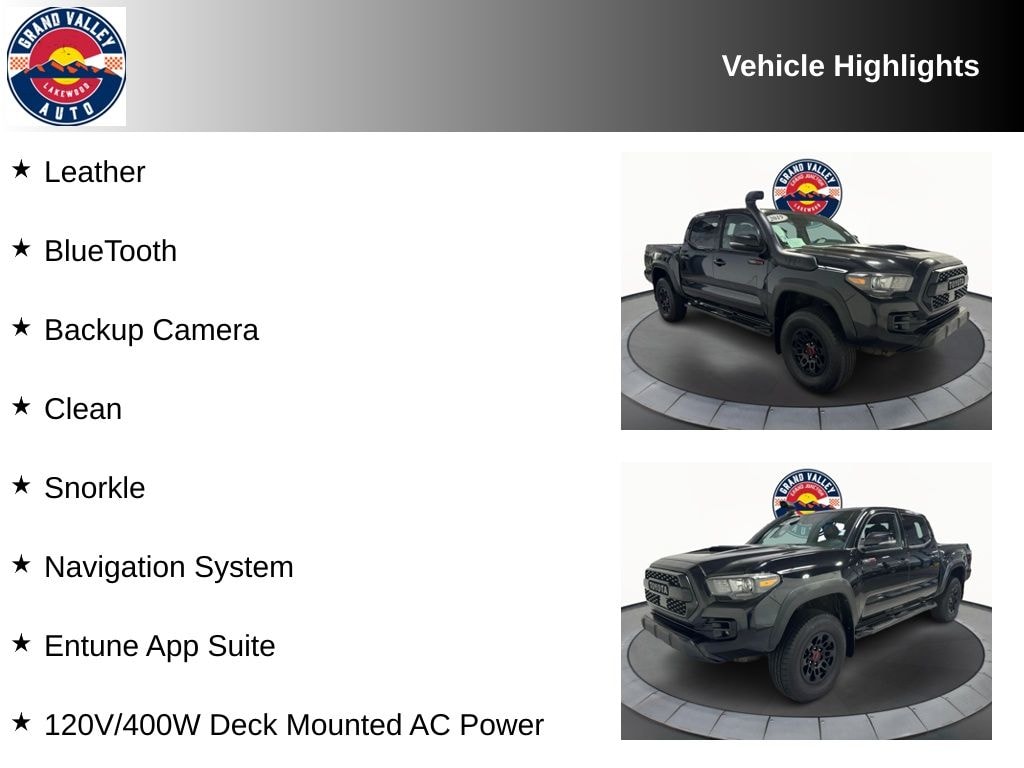 Leather, BlueTooth, Backup Camera, Clean, Snorkle, 120V/400W Deck Mounted AC Power, Blind Spot Monitor w/Rear Cross Traffic Alert, Entune App Suite, Heated front seats, Leather Shift Knob, Navigation System, Power moonroof, Projector-Beam Headlights, Rear Parking Assist Sonar, Rigid Industries LED fog lights, Steering wheel mounted audio controls, TRD Pro Leather Trim, TRD-Tuned Off-Road Suspension (TR), Wheels: 16" x 7" TRD Pro Black Alloy. Clean CARFAX. Odometer is 23969 miles below market average!