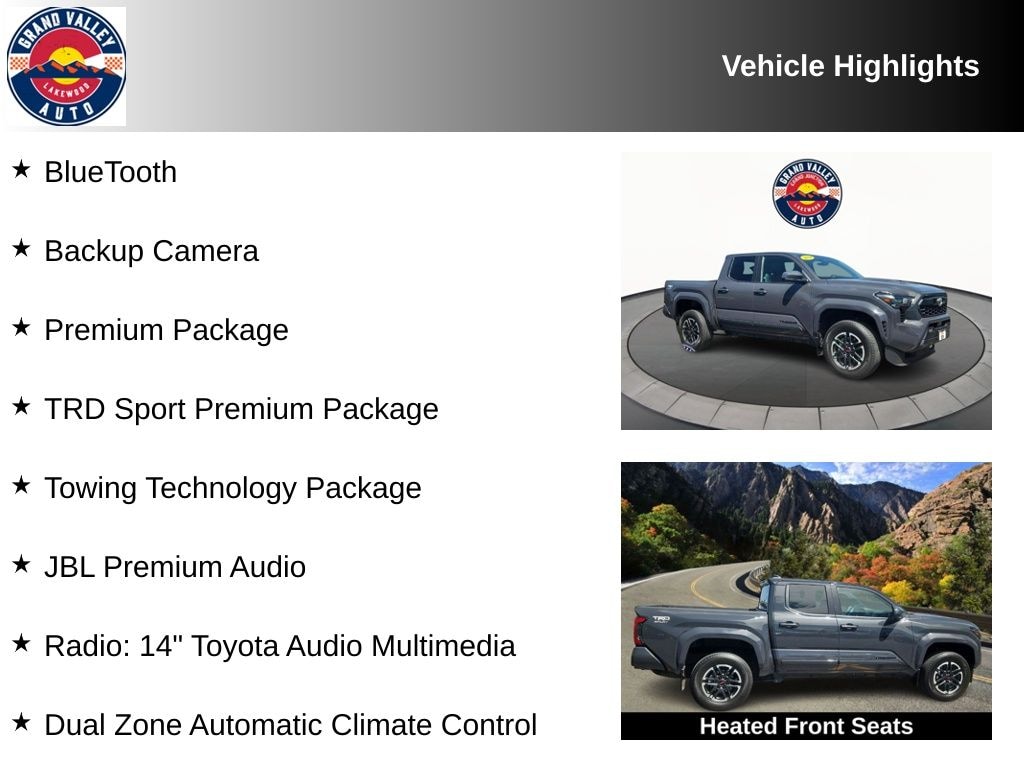 BlueTooth, Backup Camera, Premium Package, 3D Panoramic View Monitor, 8-Way Power Driver & Passenger Seat Adjusters, Apple CarPlay/Android Auto, Auto High-beam Headlights, Deck DC Power Pre-wire, Digital Key Capability, Digital Rearview Mirror, Dual Zone Automatic Climate Control, Exterior Parking Camera Rear, Front & Rear Parking Assist w/Automatic Braking, Heated & Ventilated Front Seats, Heated door mirrors, Heated Front Seats, Heated Leather-Trimmed Steering Wheel, Integrated Trailer Brake Controller, JBL Premium Audio, Leather Shift Knob, Leather steering wheel, Pedestrian Detection, Power Horizontal Rear Window, Power Tilt/Slide Moonroof w/Sliding Sunshade, Pre-Wired Auxiliary Switches, Qi-Compatible Wireless Charging, Radio: 14" Toyota Audio Multimedia, SofTex Seat Trim, TACOMA Stamped Power Open & Close Tailgate, Towing Hitch, Towing Technology Package, TRD Sport Premium Package, Wheels: 18" TRD Sport Alloy. Priced below KBB Fair Purchase Price!