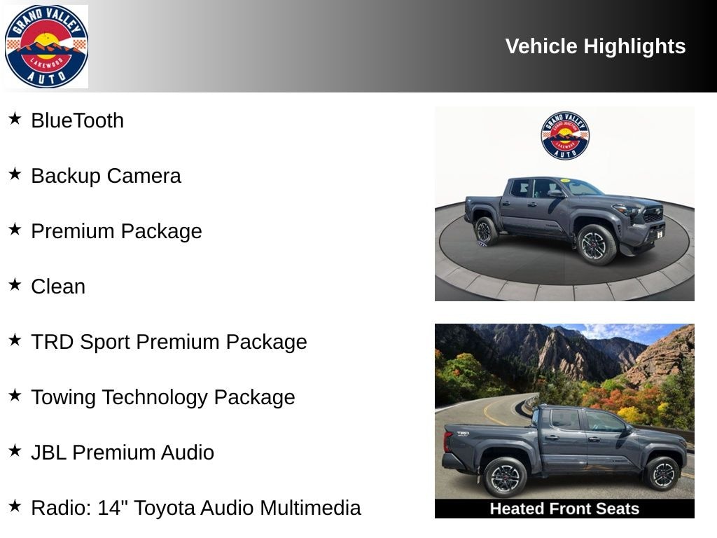 BlueTooth, Backup Camera, Premium Package, Clean, 3D Panoramic View Monitor, 8-Way Power Driver & Passenger Seat Adjusters, Apple CarPlay/Android Auto, Auto High-beam Headlights, Deck DC Power Pre-wire, Digital Key Capability, Digital Rearview Mirror, Dual Zone Automatic Climate Control, Exterior Parking Camera Rear, Front & Rear Parking Assist w/Automatic Braking, Heated & Ventilated Front Seats, Heated door mirrors, Heated Front Seats, Heated Leather-Trimmed Steering Wheel, Integrated Trailer Brake Controller, JBL Premium Audio, Leather Shift Knob, Leather steering wheel, Pedestrian Detection, Power Horizontal Rear Window, Power Tilt/Slide Moonroof w/Sliding Sunshade, Pre-Wired Auxiliary Switches, Qi-Compatible Wireless Charging, Radio: 14" Toyota Audio Multimedia, SofTex Seat Trim, TACOMA Stamped Power Open & Close Tailgate, Towing Hitch, Towing Technology Package, TRD Sport Premium Package, Wheels: 18" TRD Sport Alloy. Priced below KBB Fair Purchase Price!
