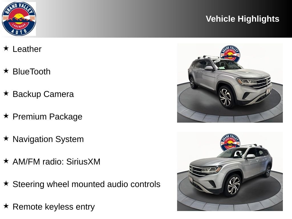 Leather, BlueTooth, Backup Camera, Premium Package, AM/FM radio: SiriusXM, Emergency communication system: VW Car-Net services (capabilities require enrollment or subscription), Fully automatic headlights, Heated door mirrors, Heated front seats, Heated steering wheel, Htd/Actively Ventilated Comfort Front Sport Seats, Leather Shift Knob, Navigation System, Perforated Vienna Leather Seating Surfaces, Power Liftgate, Power moonroof, Rain sensing wipers, Remote keyless entry, Roof rack: rails only, Steering wheel mounted audio controls, Wheels: 20" 5-Spoke 2-Tone Machined Alloy. Clean CARFAX.